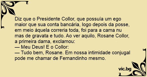 Diz que o Presidente Collor, que possuía um ego maior que sua conta bancária, logo depois da posse, em meio àquela correria toda, foi para a cama nu mas de gravata e tudo. Ao ver aquilo, Rosane Collor, a primeira dama, exclamou: