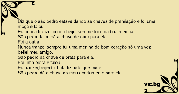 Diz que o são pedro estava dando as chaves de premiação e foi uma moça e falou: