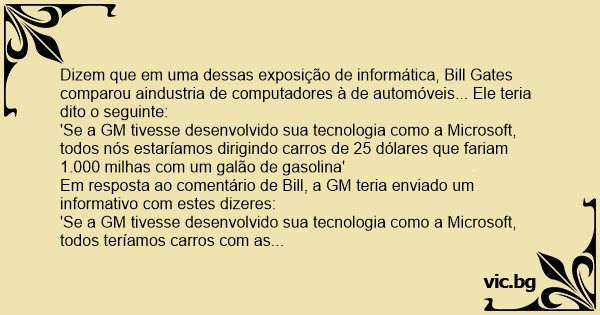 Dizem que em uma dessas exposição de informática, Bill Gates comparou aindustria de computadores à de automóveis... Ele teria dito o seguinte: