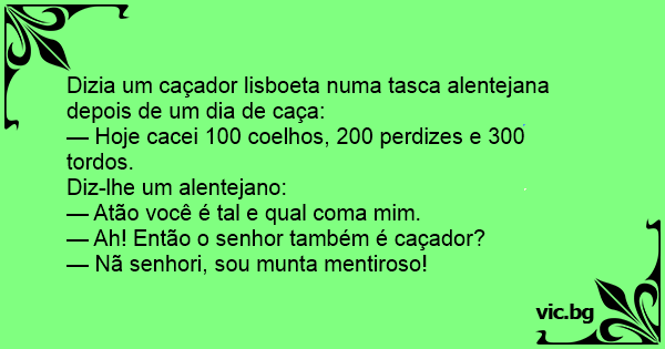 — Hoje cacei 100 coelhos, 200 perdizes e 300 tordos.