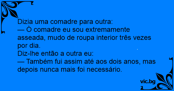 — Ò comadre eu sou extremamente asseada, mudo de roupa interior três vezes por dia.