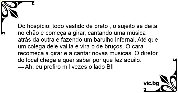 Do hospício, todo vestido de preto , o sujeito se deita no chão e começa a girar, cantando uma música atrás da outra e fazendo um barulho infernal. Até que um colega dele vai lá e vira o de bruços. O cara recomeça a girar e a cantar novas musicas. O diretor do local chega e quer saber por que fez aquilo.