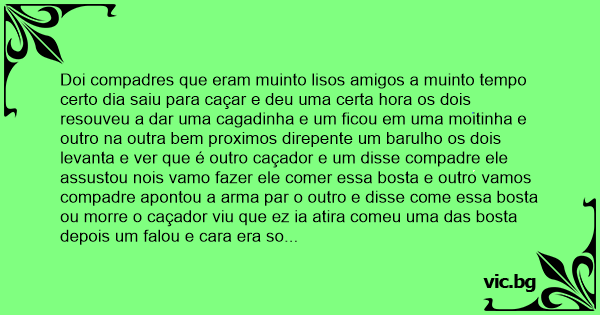 Doi compadres que eram muinto lisos amigos a muinto tempo certo dia saiu para caçar e deu uma certa hоrа os dois resouveu a dar uma cagadinha e um ficou em uma moitinha e outro na outra bem proximos direpente um barulho os dois levanta e ver que é outro caçador e um disse compadre ele assustou nois vamo fazer ele comer essa bosta e outro vamos compadre apontou a arma par o outro e disse come essa bosta ou morre o caçador viu que ez ia atira comeu uma das bosta depois um falou e cara era so bricadeira nois tamem e caçado ingol oçe bebe um poquim da nossa água e ocara bebeu a água e ficou purali depois os doi discuidou e o cara passou a mão na aram e falou agora seis dois come a outra bosta!! um olhou para o outro e disse e agora cumpade ou disse agora e cumê im quanto ta quente !!!