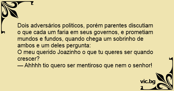 Dois adversários politicos, porém parentes discutiam o que cada um faria em seus governos, e prometiam mundos e fundos, quando chega um sobrinho de ambos e um deles pergunta: