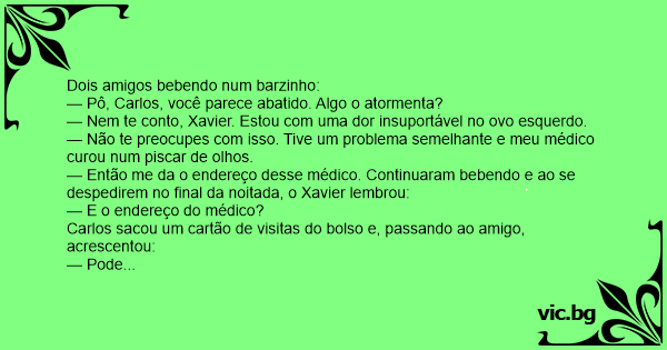 — Então me da o endereço desse médico. Continuaram bebendo e ao se despedirem no final da noitada, o Xavier lembrou: