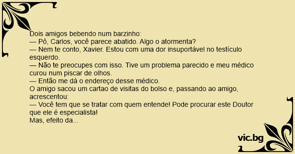 Dois amigos bebendo num barzinho: — Pô, Carlos, você parece abatido. Algo o atormenta? — Nem te conto, Xavier. Estou com uma dor insuportável no testículo esquerdo. — Não te preocupes com isso. Tive um problema parecido e meu médico curou num piscar de olhos. — Então me dá o endereço desse médico. O amigo sacou um cartao de visitas do bolso e, passando ao amigo, acrescentou: — Você tem que se tratar com quem entende! Pode procurar este Doutor que ele é especialista! Mas, efeito da bebedeira, por engano passou o cartao do advogado dele. Dia seguinte, Xavier procurou o endereço do cartao. Encontra a sala, a atendente pede para aguardar e, ao adentrar na sala do Doutor, encontrando um senhor bem vestido atrás de uma mesa, começa a descrever seu problema: — Doutor, estou com uma dor incrível no testículo esquerdo. — Sinto muito, meu amigo, mas sou especialista em Direito. — Pô, vá ser especialista assim no raio que o parta!