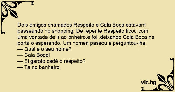 Dois amigos chamados Respeito e Cala Boca estavam passeando no shopping. De repente Respeito ficou com uma vontade de ir ao bnheiro,e foi ,deixando Cala Boca na porta o esperando. Um homen passou e perguntou-lhe: