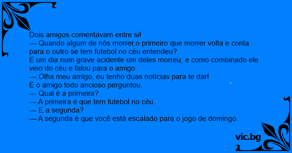 — Quando algum de nós morrer,o primeiro que morrer volta e conta para o outro se tem futebol no céu entendeu?
