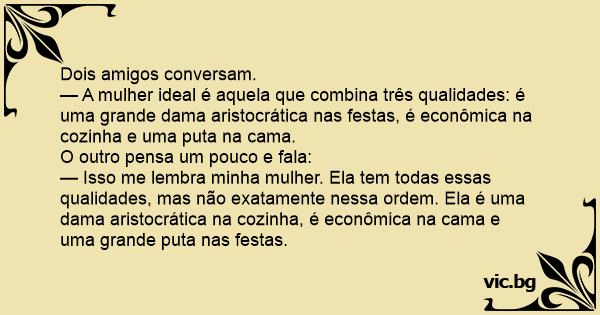 — A mulher ideal é aquela que combina três qualidades: é uma grande dama aristocrática nas festas, é econômica na cozinha e uma рuта na cama.