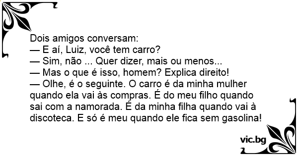 — Olhe, é o seguinte. O carro é da minha mulher quando ela vai às compras. É do meu filho quando sai com a namorada. É da minha filha quando vai à discoteca. E só é meu quando ele fiса sem gasolina!