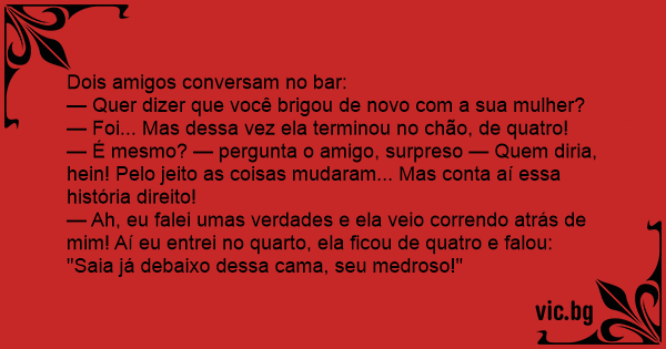 — Ah, eu falei umas verdades e ela veio correndo atrás de mim! Aí eu entrei no quarto, ela ficou de quatro e falou: