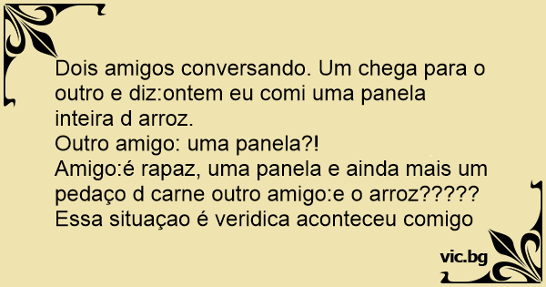 Dois amigos conversando. Um chega para o outro e diz:ontem eu comi uma panela inteira d arroz.