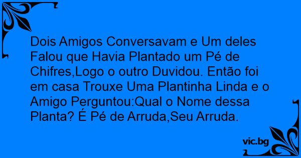 Dois Amigos Conversavam e Um deles Falou que Havia Plantado um Pé de Chifres,Logo o outro Duvidou. Então foi em casa Trouxe Uma Plantinha Linda e o Amigo Perguntou:Qual o Nome dessa Planta? É Pé de Arruda,Seu Arruda.
