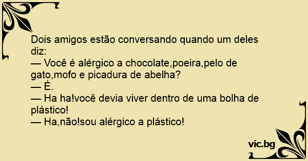 — Você é alérgico a chocolate,poeira,pelo de gato,моfо e picadura de abelha?