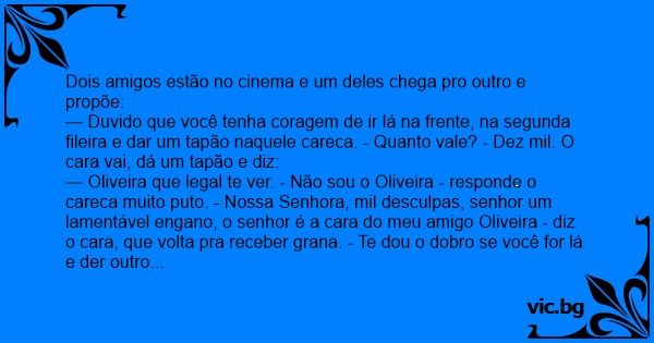 — Oliveira que legal te ver. - Não sou o Oliveira - responde o careca muito рuто. - Nossa Senhora, mil desculpas, senhor um lamentável engano, o senhor é a cara do meu amigo Oliveira - diz o cara, que volta pra receber grana. - Te dou o dobro se você for lá e der outro tapa no mesmo careca. O cara тора e vai lá dar outro tapão no careca. - O Oliveira, você por aqui que coincidência. - Já te disse que não sou o Oliveira - se esquenta o careca indo pra cima do sujeito. O pessoal segura o careca e ele vai receber os vinte mil. Mas recebe outro desafio: