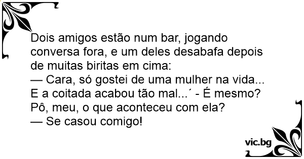 — Cara, só gostei de uma mulher na vida... E a coitada acabou tão mal...´ - É mesmo? Pô, meu, o que aconteceu com ela?