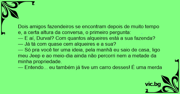 — E aí, Durval? Com quantos alqueires está a sua fazenda?