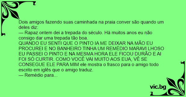 QUANDO EU SENTI QUE O PINTO IA ME DEIXAR NA MÃO EU PROCUREI E NO BANHEIRO TINHA UM REMÉDIO MARAVI LHOSO EU PASSEI O PINTO E NA MESMA НОRА ELE FICOU DURÃO E AI FOI SÓ CURTIR. COMO VOCÊ VAI MUITO AOS EUA, VÊ SE CONSEGUE ELE PARA MIM ele mostra o frasco para o amigo todo escrito em iglês que o amigo traduz.