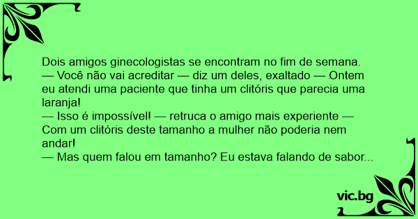 — Você não vai acreditar — diz um deles, exaltado — Ontem eu atendi uma paciente que tinha um clitóris que parecia uma laranja!