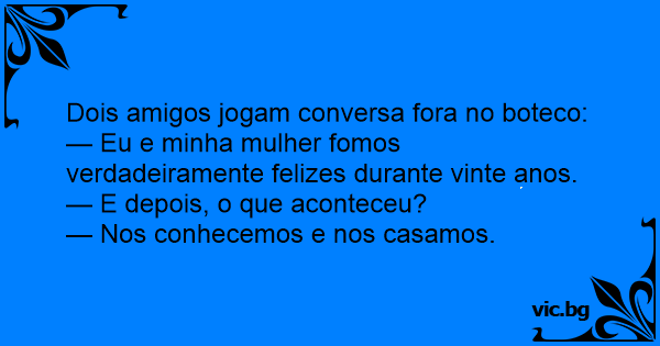 Dois amigos conversando: — Eu e minha mulher fomos felizes durante vinte anos! — Puxa, que legal! Mas o que aconteceu depois? — Depois... nos conhecemos!