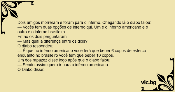 — É que no inferno americano você terá que beber 6 copos de esterco enquanto no brasileiro você tem que beber 10 copos.