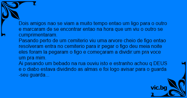 Ai pasando um bebado na rua ouviu isto e estranho achou q DEUS e o diabo estava dividindo as almas e foi logo avisar para o guarda -seu guarda DEUS e o diabo estao dividindo as almas ali e eles foram correndo la ver enquanto isto tinha caido dois figo.