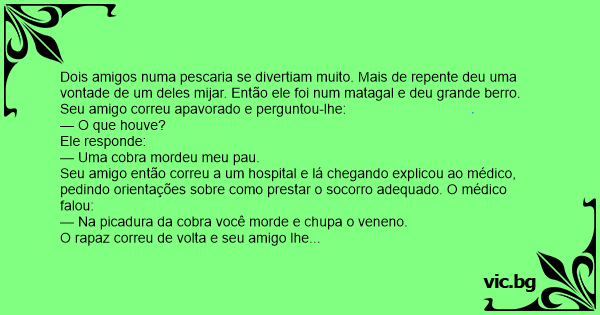 Dois amigos numa pescaria se divertiam muito. Mais de repente deu uma vontade de um deles mijar. Então ele foi num matagal e deu grande berro.