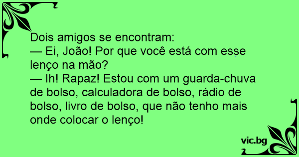 — Ih! Rapaz! Estou com um guarda-chuva de bolso, calculadora de bolso, rádio de bolso, livro de bolso, que não tenho mais onde colocar o lenço!