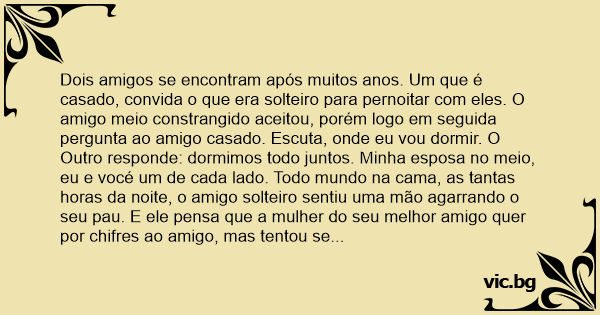 Dois amigos se encontram após muitos anos. Um que é casado, convida o que era solteiro para pernoitar com eles. O amigo meio constrangido aceitou, porém logo em seguida pergunta ao amigo casado. Escuta, onde eu vou dormir. O Outro responde: dormimos todo juntos. Minha esposa no meio, eu e vocé um de cada lado. Todo mundo na cama, as tantas horas da noite, o amigo solteiro sentiu uma mão agarrando o seu раu. E ele pensa que a mulher do seu melhor amigo quer por chifres ao amigo, mas tentou se portar bem e assim nada aconteceu. No dia seguinte antes de se despedir, volta para o amigo e diz. Colega, sinto muito mas a sua esposa não presta para nada, pois passou a noite toda segurando o meu раu.