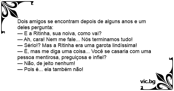 Dois amigos se encontram depois de alguns anos e um deles pergunta: