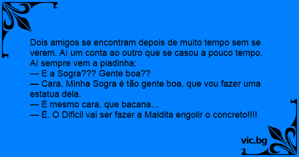 — Cara, Minha Sogra é tão gente boa, que vou fazer uma estatua dela.