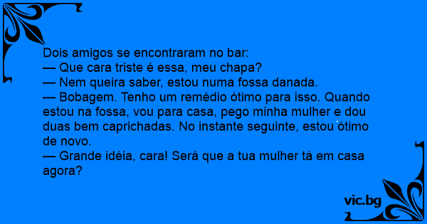 — Bobagem. Tenho um remédio ótimo para isso. Quando estou na fossa, vou para casa, pego minha mulher e dou duas bem caprichadas. No instante seguinte, estou ótimo de novo.
