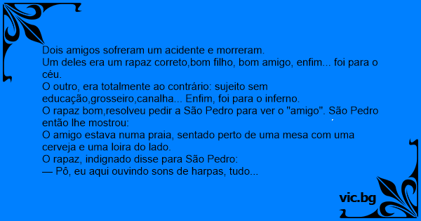 O rapaz bom,resolveu pedir a São Pedro para ver o "amigo". São Pedro então lhe mostrou: