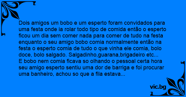 Dois amigos um bobo e um esperto foram convidados para uma festa onde ia rolar todo tipo de comida então o esperto ficou um dia sem comer nada para comer de tudo na festa enquanto o seu amigo bobo comia normalmente então na festa o esperto comia de tudo o que vinha ele comia, bolo doce, bolo salgado. Salgadinho,guarana,brigadeiro etc...
