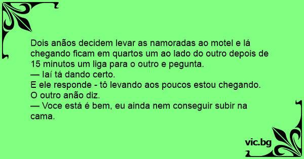 Dois anãos decidem levar as namoradas ao motel e lá chegando ficam em quartos um ao lado do outro depois de 15 minutos um liga para o outro e pegunta.