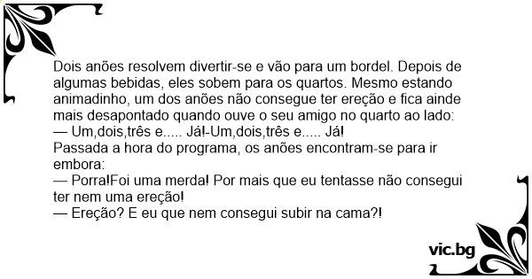 Dois anões resolvem divertir-se e vão para um bordel. Depois de algumas bebidas, eles sobem para os quartos. Mesmo estando animadinho, um dos anões não consegue ter ereção e fiса ainde mais desapontado quando ouve o seu amigo no quarto ao lado: