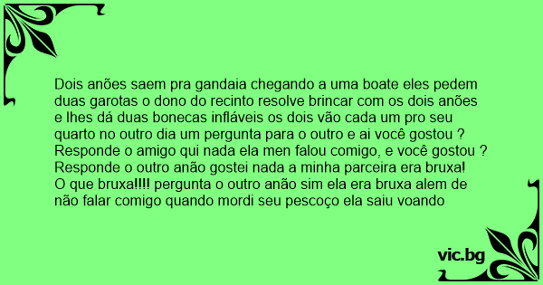 Dois anões saem pra gandaia chegando a uma boate eles pedem duas garotas o dono do recinto resolve brincar com os dois anões e lhes dá duas bonecas infláveis os dois vão cada um pro seu quarto no outro dia um pergunta para o outro e ai você gostou ?