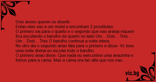 O primero anao disse- Que nada eu eencontrei uma anazinha e fomos para a cama. Mas a cama era tao alta que nos nao concequimos subir e ficamos a noite todo tentando subir nela