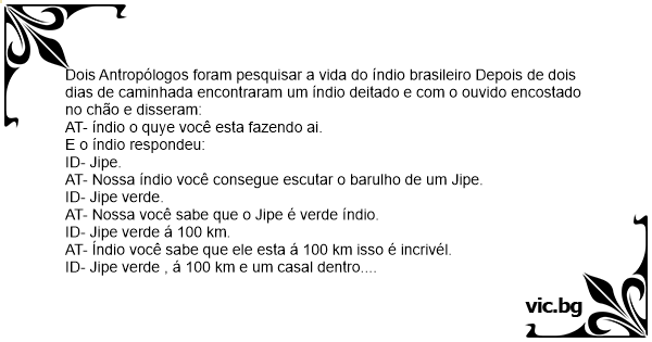 Dois Antropólogos foram pesquisar a vida do índio brasileiro Depois de dois dias de caminhada encontraram um índio deitado e com o ouvido encostado no chão e disseram: