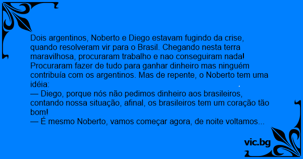 Dois argentinos, Noberto e Diego estavam fugindo da crise, quando resolveram vir para o Brasil. Chegando nesta terra maravilhosa, procuraram trabalho e nao conseguiram nada! Procuraram fazer de tudo para ganhar dinheiro mas ninguém contribuía com os argentinos. Mas de repente, o Noberto tem uma idéia: