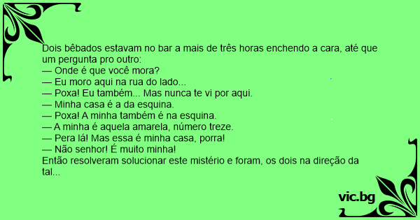 Dois bêbados estavam no bar a mais de três horas enchendo a cara, até que um pergunta pro outro: