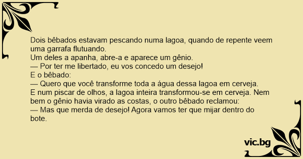 E num piscar de olhos, a lagoa inteira transformou-se em cerveja. Nem bem o gênio havia virado as costas, o outro bêbado reclamou: