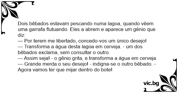 Dois bêbados estavam pescando numa lagoa, quando vêem uma garrafa flutuando. Eles a abrem e aparece um gênio que diz: