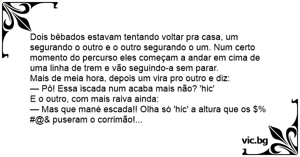 Dois bêbados estavam tentando voltar pra casa, um segurando o outro e o outro segurando o um. Num certo momento do percurso eles começam a andar em cima de uma linha de trem e vão seguindo-a sem parar.