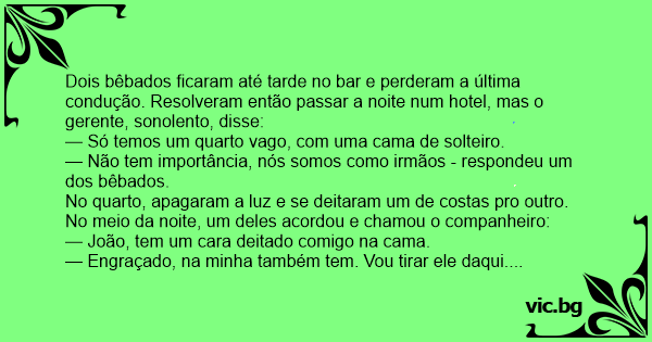 Dois bêbados ficaram até tarde no bar e perderam a última condução. Resolveram então passar a noite num hotel, mas o gerente, sonolento, disse: