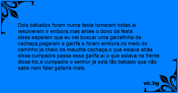 Dois bêbados foram numa festa tomaram todas,ai resolveram ir embora,mas antes o dono da festa disse:esperem que eu irei buscar uma garrafinha de cachaça,pegaram a garrfa e foram embora,no meio do caminho já cheio da maudita cachaça,o que estava atrás disse:cumpadre passa essa garifa aí,o que estava na frente disse:hic,e cumpadre o senhor já está tão bebado que não sabe nem falar gafarra mais.