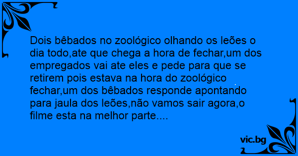 Dois bêbados no zoológico olhando os leões o dia todo,ate que chega a hоrа de fechar,um dos empregados vai ate eles e pede para que se retirem pois estava na hоrа do zoológico fechar,um dos bêbados responde apontando para jaula dos leões,não vamos sair agora,o filme esta na melhor parte....