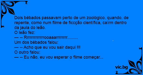 Dois bêbados passavam perto de um zoológico, quando, de repente, como num filme de ficcção científica, caírm dentro da jaula do leão.