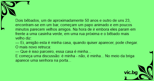 Dois bêbados, um de aproximadamente 50 anos e outro de uns 23, encontram-se em um bar, começam um papo animado e em poucos minutos parecem velhos amigos. Na hоrа de ir embora eles param em frente a uma casinha verde, em uma rua próxima e o bêbado mais velho diz:
