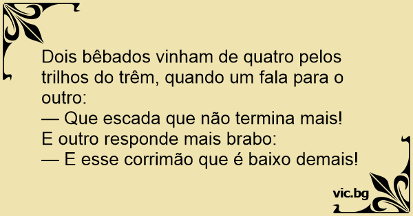 Dois bêbados vinham de quatro pelos trilhos do trêm, quando um fala para o outro: